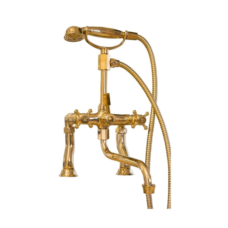 A solid brass deck-mounted bath tap with a hand shower, featuring a traditional swivel spout.
