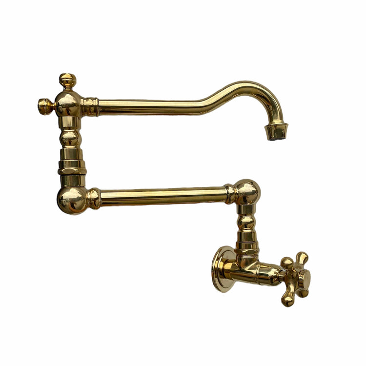A solid brass wall-mounted pot filler with a single handle.