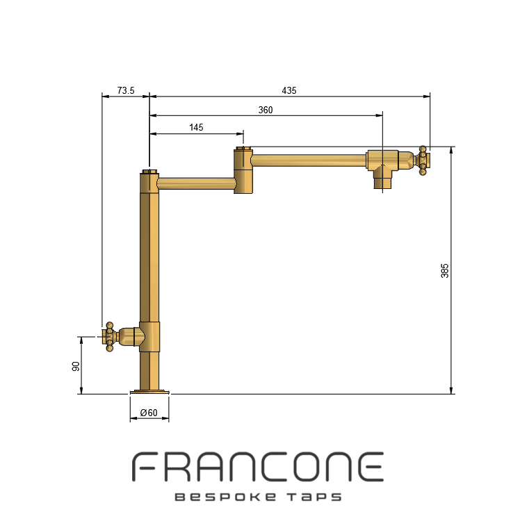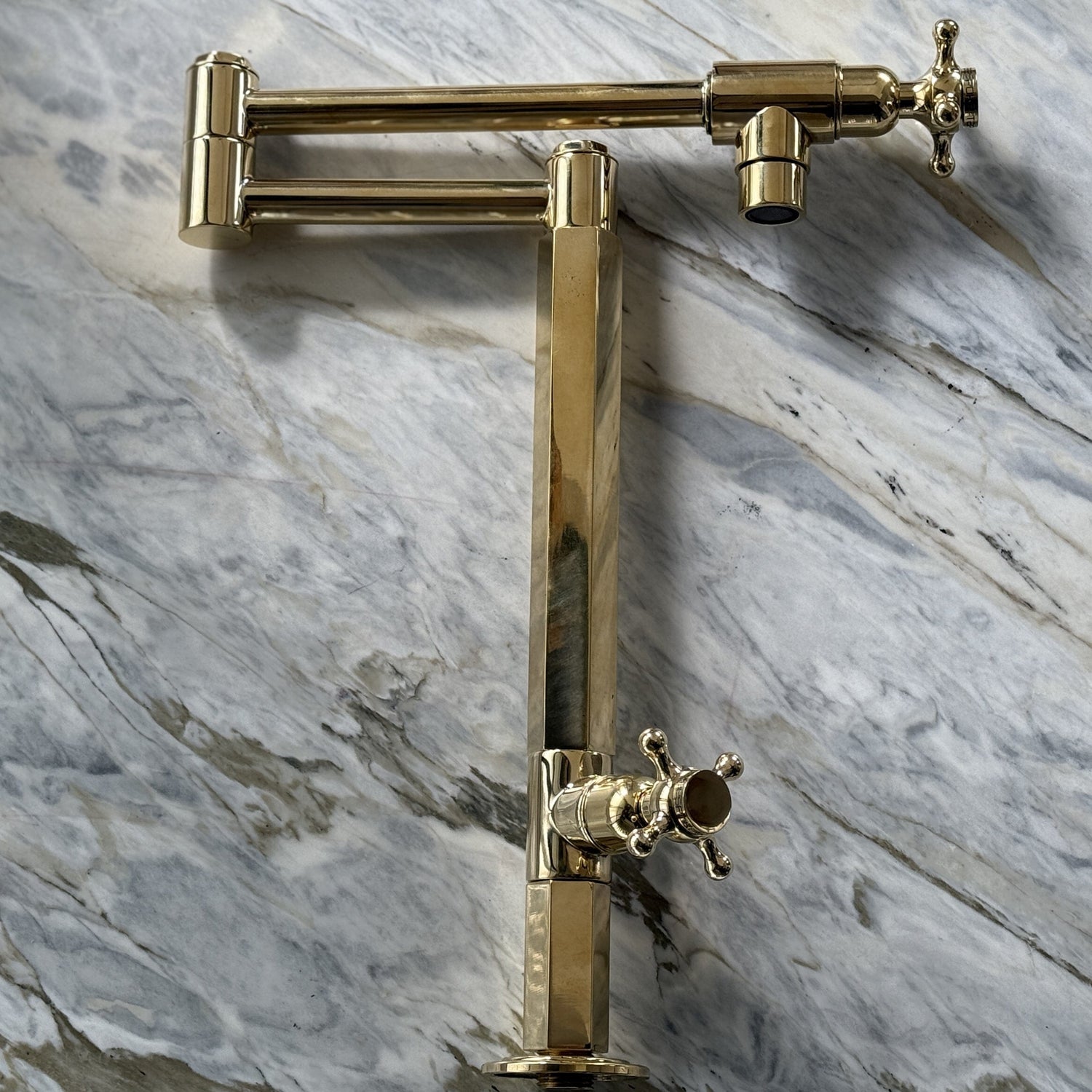 A solid brass deck-mounted bespoke pot filler with double handle.