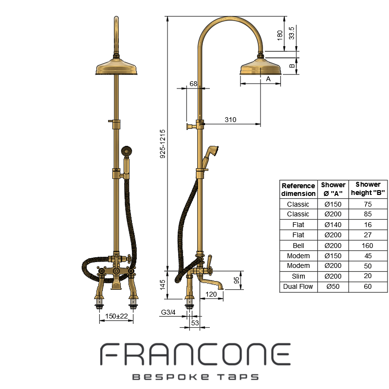 Designed with showers over freestanding or fitted baths in mind, the BTS13D does it all. A column extension of 30cm is included in the order and the shower head measures 20cm as standard and can be adjusted in angle. For Ceramic handles B&W, kindly specify your preference by indicating either Black or White in the order notes.