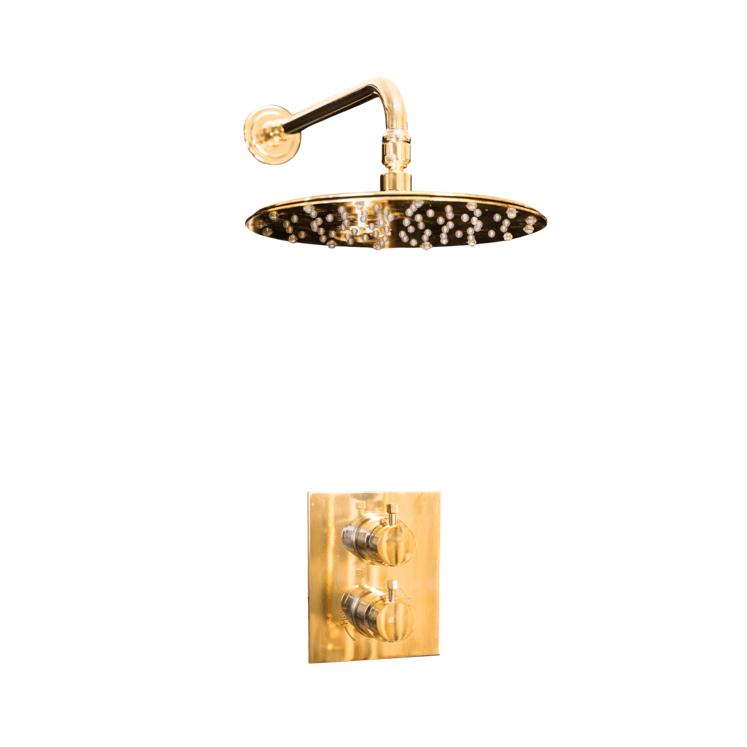 A solid brass wall-mounted concealed thermostatic shower with modern handles and slim shower head.
