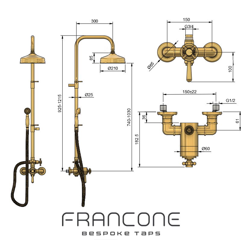 A solid brass wall-mounted thermostatic column shower with hand shower.