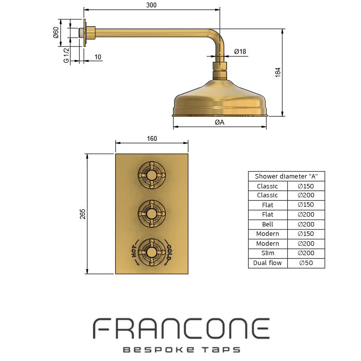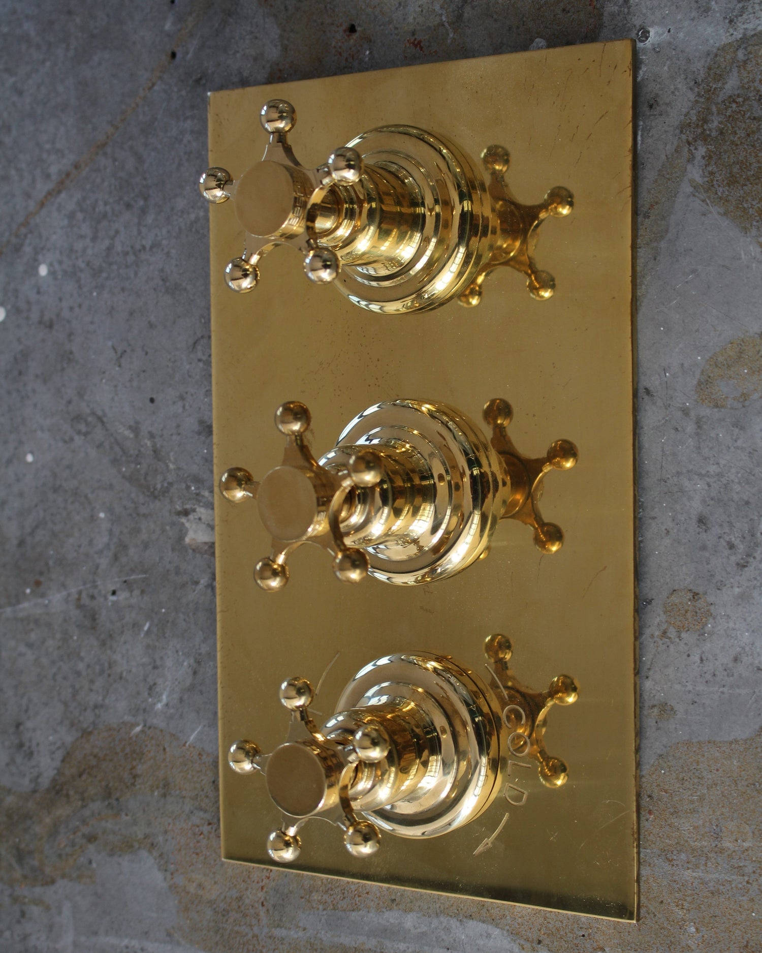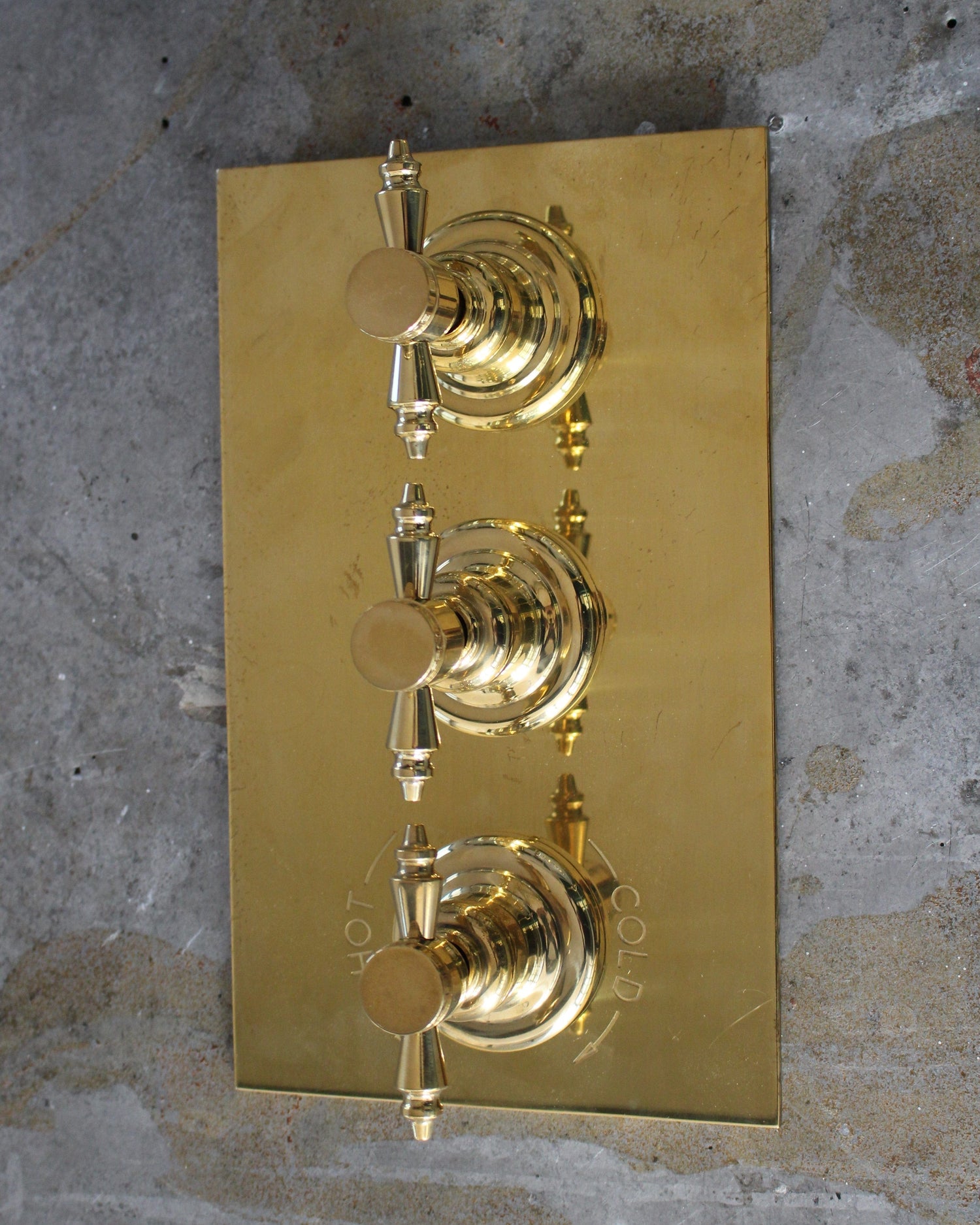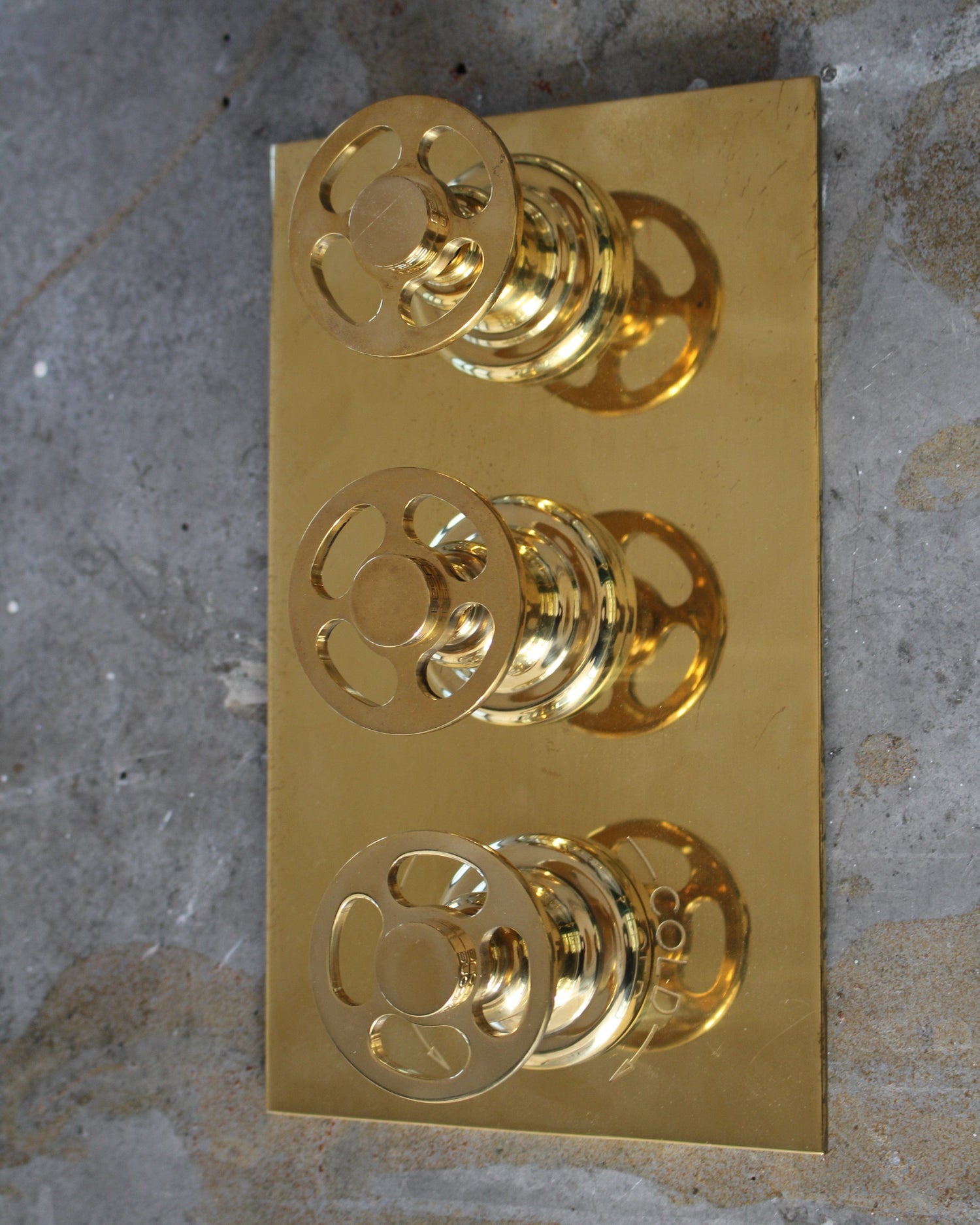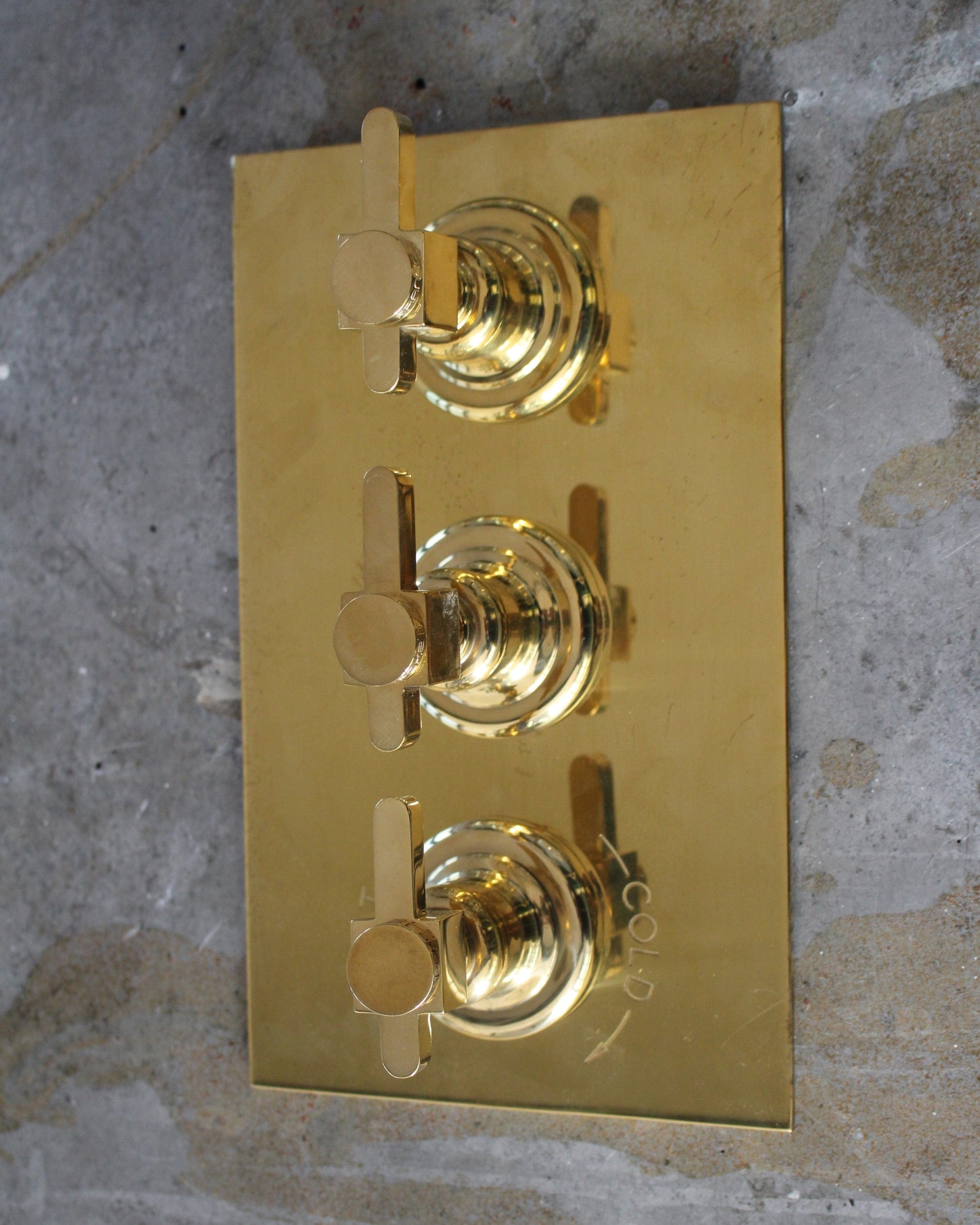 A sleek and concealed wall-mounted shower that features our classic shower head, measuring 15-20cm in diameter which adjusts angle, and a thermostatic backplate with three handles in designs of your choice. The newly upgraded backplate measures 16cmx26cm and is engraved with Hot and Cold. You can choose a mix of different handle designs by selecting the most expensive and writing an order on your note.