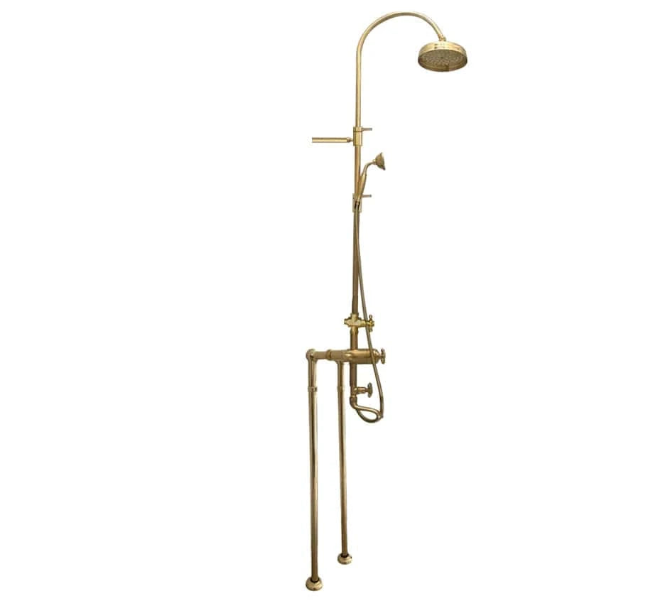 A floor mounted solid brass thermostatic column shower with hand shower and bath filler.