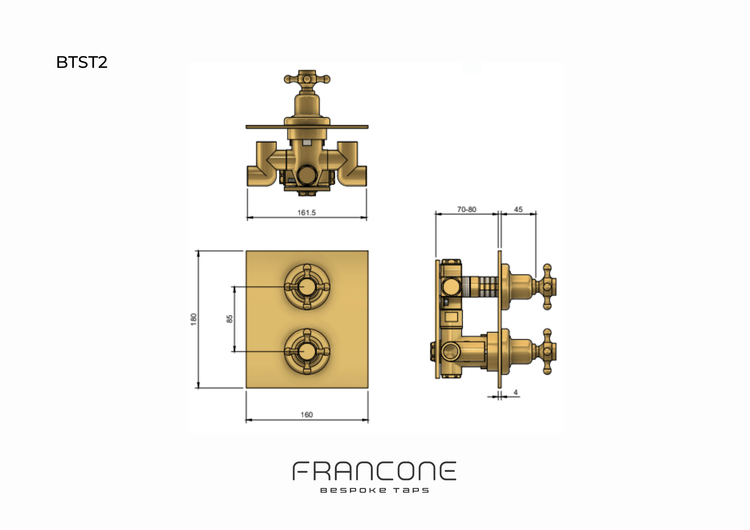 Our BTST model is designed for when you wish to purchase a thermostatic mixer on its own, to be paired with a separate shower head, etc. This model features either a concealed or exposed thermostatic mixer which comes with different handles and in different finishes. Each handle dictates either the flow or temperature of the water, together on a thick brass back plate.
